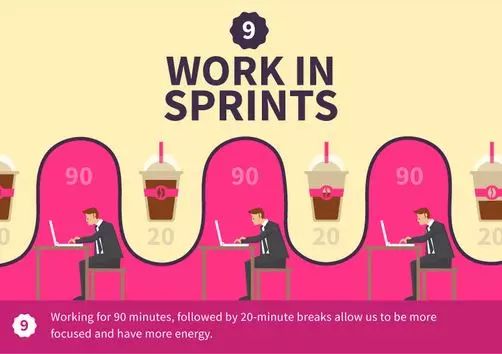 工作90分钟,休息20分钟。这种方法能让人集中精力,拥有更充沛的能量。